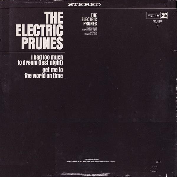 The Electric Prunes' self-titled debut (with "I Had Too Much to Dream (Last Night)" and "Get Me to the World on Time" acting as a subtitle on the front sleeve, though not on the LP spine) was an interesting but way-erratic psychedelic album. The two aforementioned hits led off sides one and two respectively, and were easily the highlights of a set that boasted continuously imaginative production, but inconsistent songwriting. There were some tracks that proved the group were more than two-hit wonders. The group original "Train for Tomorrow," for instance, had the edgy melody and atmosphere typical of several Tucker-Mantz compositions of the time, unexpectedly ending with a jazz guitar coda; the nutty "Sold to the Highest Bidder" boasted a futuristic sped-up guitar that sounded like a berserk balalaika; and "Try Me on for Size" was a psych-punked-out Paul Revere & the Raiders. On the downside, there were some positively frightful quasi-psychedelic vaudevillian fairytale tunes; it is hard to believe the same songwriting team that gifted us with "Get Me to the World on Time" was also responsible for "Tunerville Trolley" and "About a Quarter to Nine." Part of the problem was that the group's identity was so subject to the material and production bestowed upon them by outside songwriter and producers, as the band themselves wrote only two of the tracks. There's about two-thirds of a good album here, though, chock-full of intriguing and sometimes wacky reverberation and guitar effects. -- Richie Unterberger, All-Music Guide