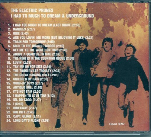 This, as much as Edsel's best-of compilation, should be the centerpiece of any Electric Prunes collection, combining their first two LPs onto one CD. I Had Too Much To Dream was a strong beginning, presenting both the band's pop-psychedelia and garage-punk sides. In addition to the title tune and "Get Me to the World On Time", that album was highlighted by "Onie", an unexpectedly sweet love song of the era (reminiscent of the Velvet Underground's "There She Goes Again"), the electric mandolin-driven "Sold to the Highest Bidder", the punk-edged "Luvin'", and the bluesy "Try Me On for Size". Some of the other songs haven't held up nearly as well -- "About a Quarter to Nine" could have been a Davy Jones-Monkees track, and "The King Is In the Counting House" and "The Toonerville Trolley" are silly psychedelia. The complete Underground is the real virtue of this disc -- "The Great Banana Hoax" is a powerful, snarling, fuzz-laden garage-punk masterpiece that even gives a nod to the Beatles' "A Day In the Life", and heralds the high point of the group's studio history. "Children of Rain" is one of a handful of psychedelic tunes to feature an electric autoharp, and it makes a special addition to a pretty fair song with a great beat; the Goffin-King "I Happen to Love You" could pass for a great lost Mike Nesmith-Monkees cosmic country song, and the rest of the songs, leading up to the punk concert favorite "Long Day's Flight", is filled with guitar sounds that shimmer and crunch. (European import) -- Bruce Eder, All-Music Guide